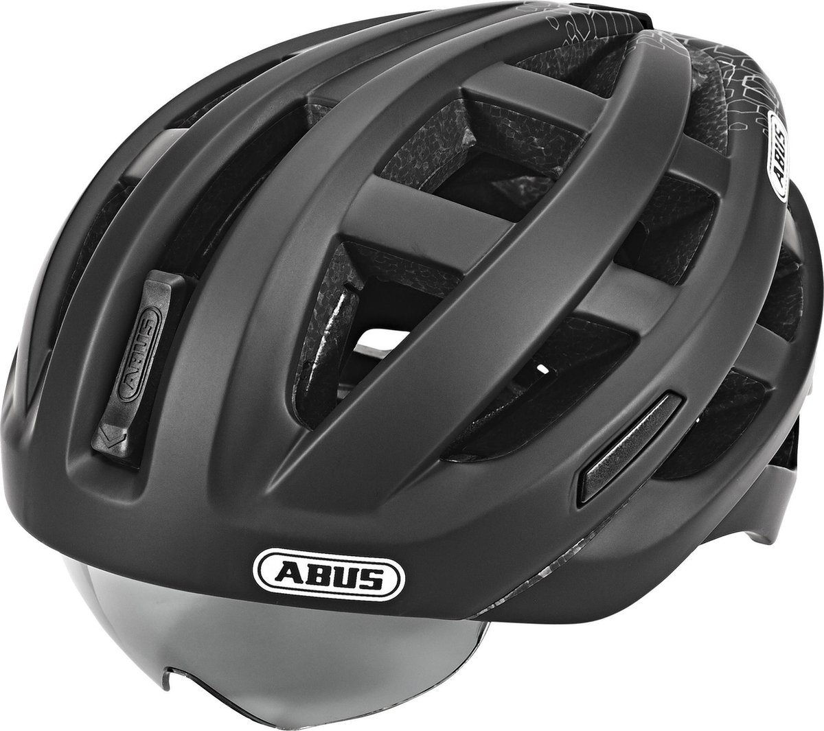 Com viseira integrada, que pode ser encaixada com segurança e totalmente dentro do capacete.